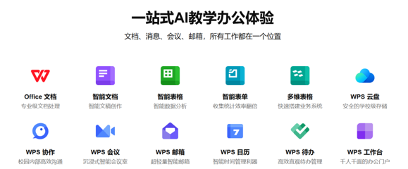 整合全品类创作工具(Office/PDF/智能文档/多维表格等)与协同应用(会议/协作/邮箱/日历),无需多平台切换,高效覆盖教学、科研、管理全场景。